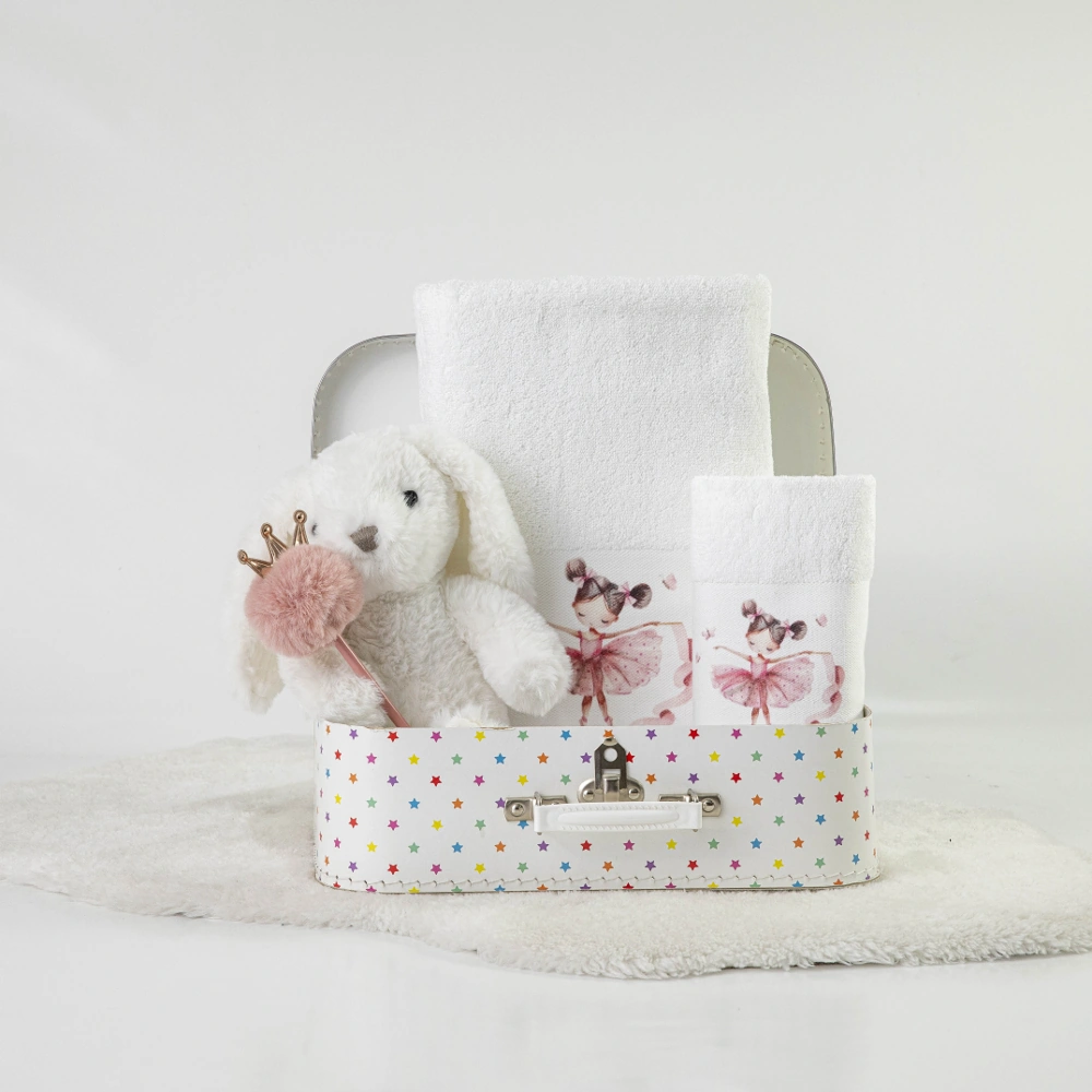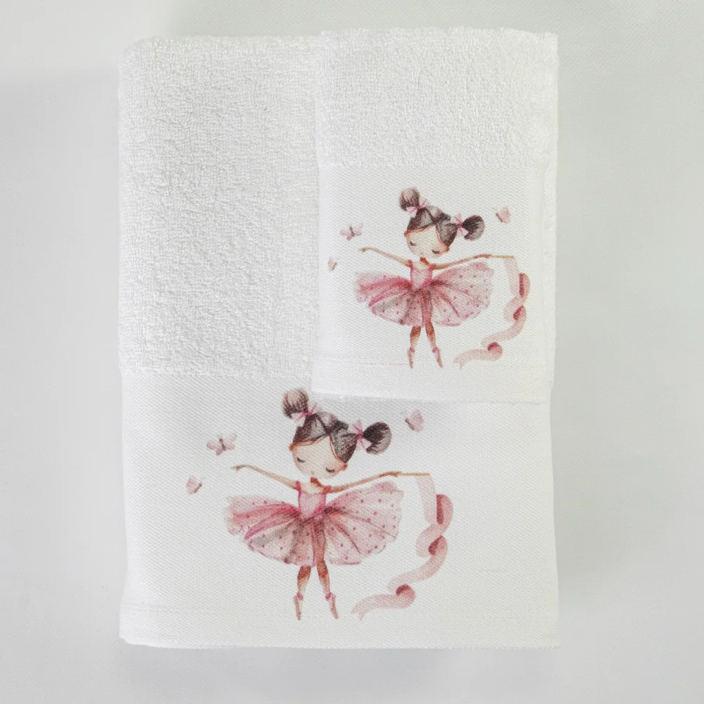 Σετ πετσέτες 2 τεμαχίων, μπάνιου και χειρός, από ύφασμα φροτέ πενιέ, 100% βαμβακερό, μονόχρωμο, λευκό, με ψηφιακή εκτύπωση, σχέδιο μπαλαρίνα.