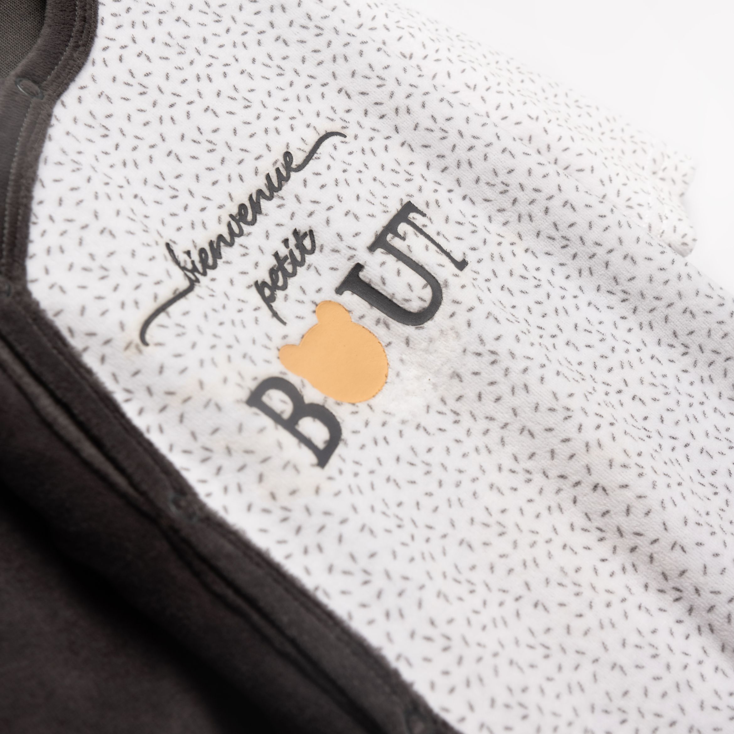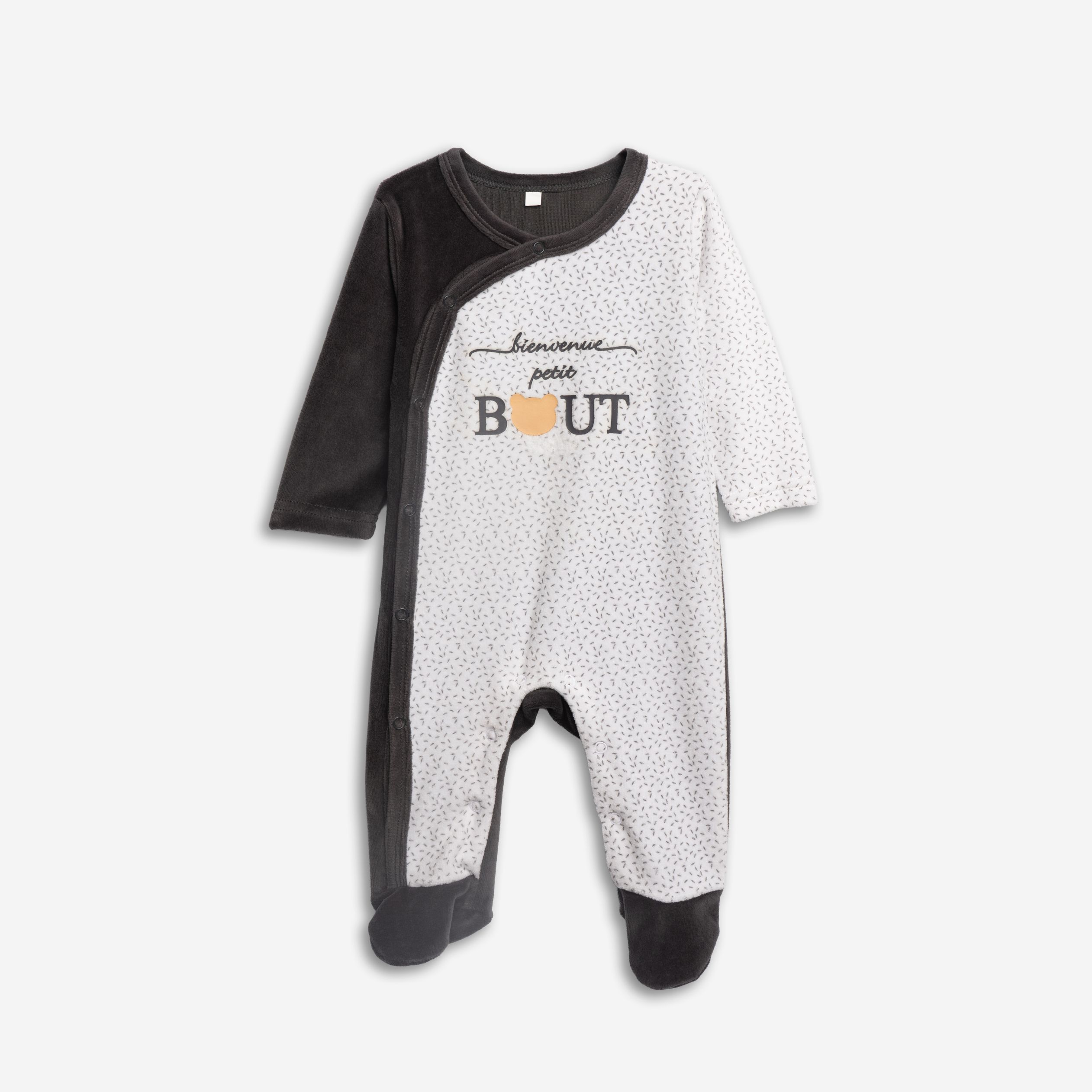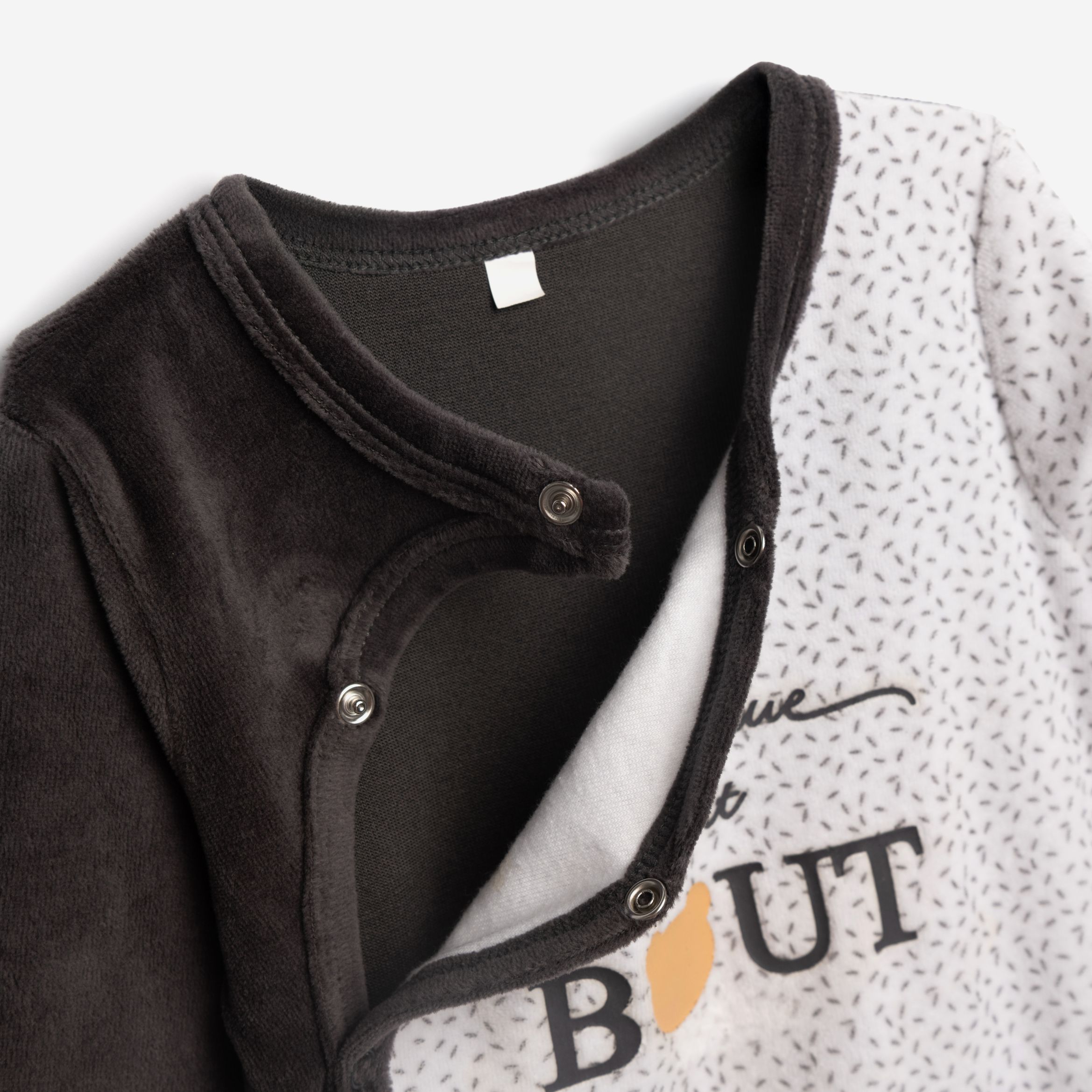 Φορμάκι μακρυμάνικο βελουτέ με τύπωμα σε χρώμα μαύρο/άσπρο τύπος βρεφανάπτυξη για 1-6 μηνών αγόρι.Με κουμπιά στη μπροστινή μεριά της φόρμας. Η συνθεσή του είναι 75% βαμβάκι και 25% πολυέστερα.