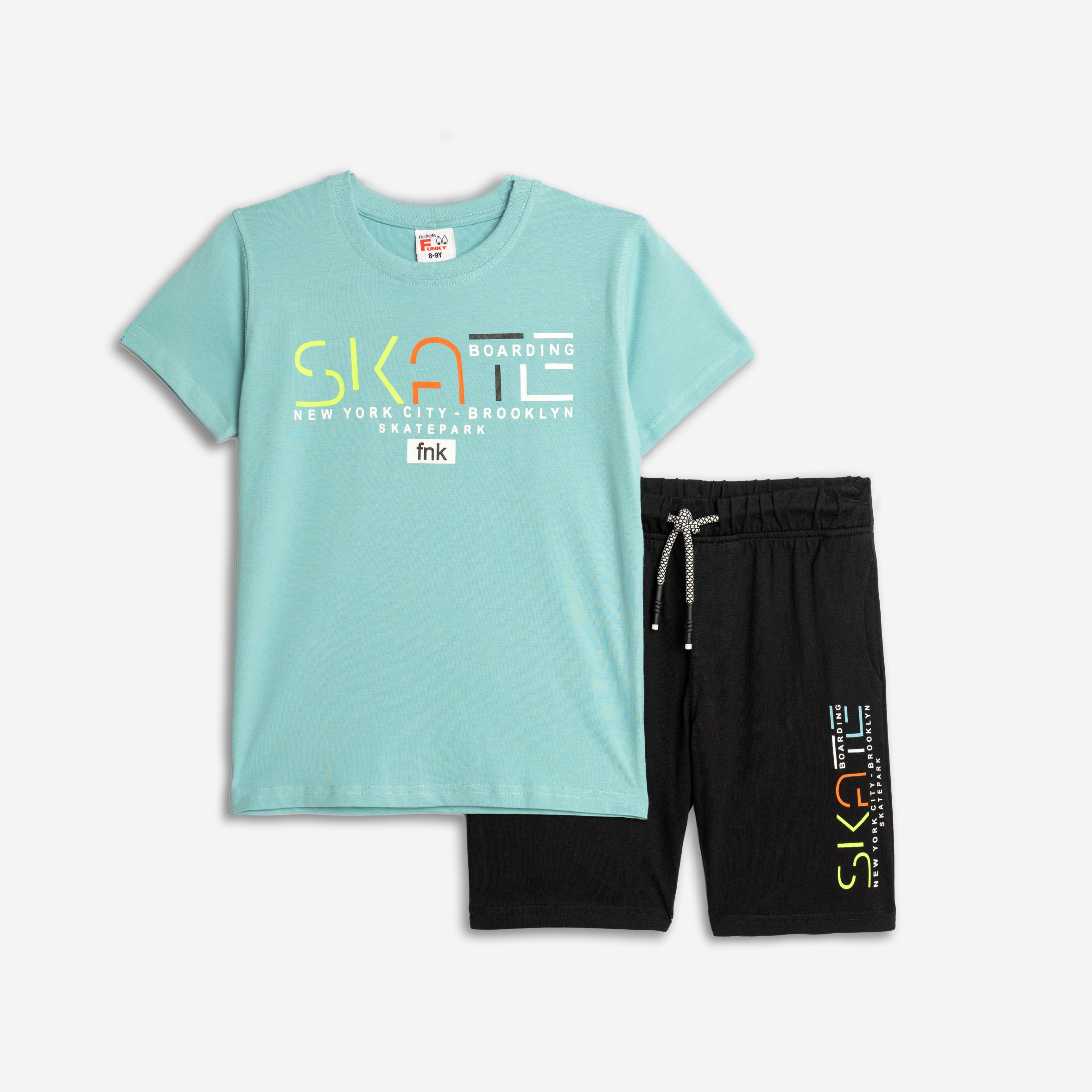 Σετ μακό κοντομάνικο μπλουζάκι και σορτσάκι με λάστιχο στη μέση. 100% βαμβάκι.