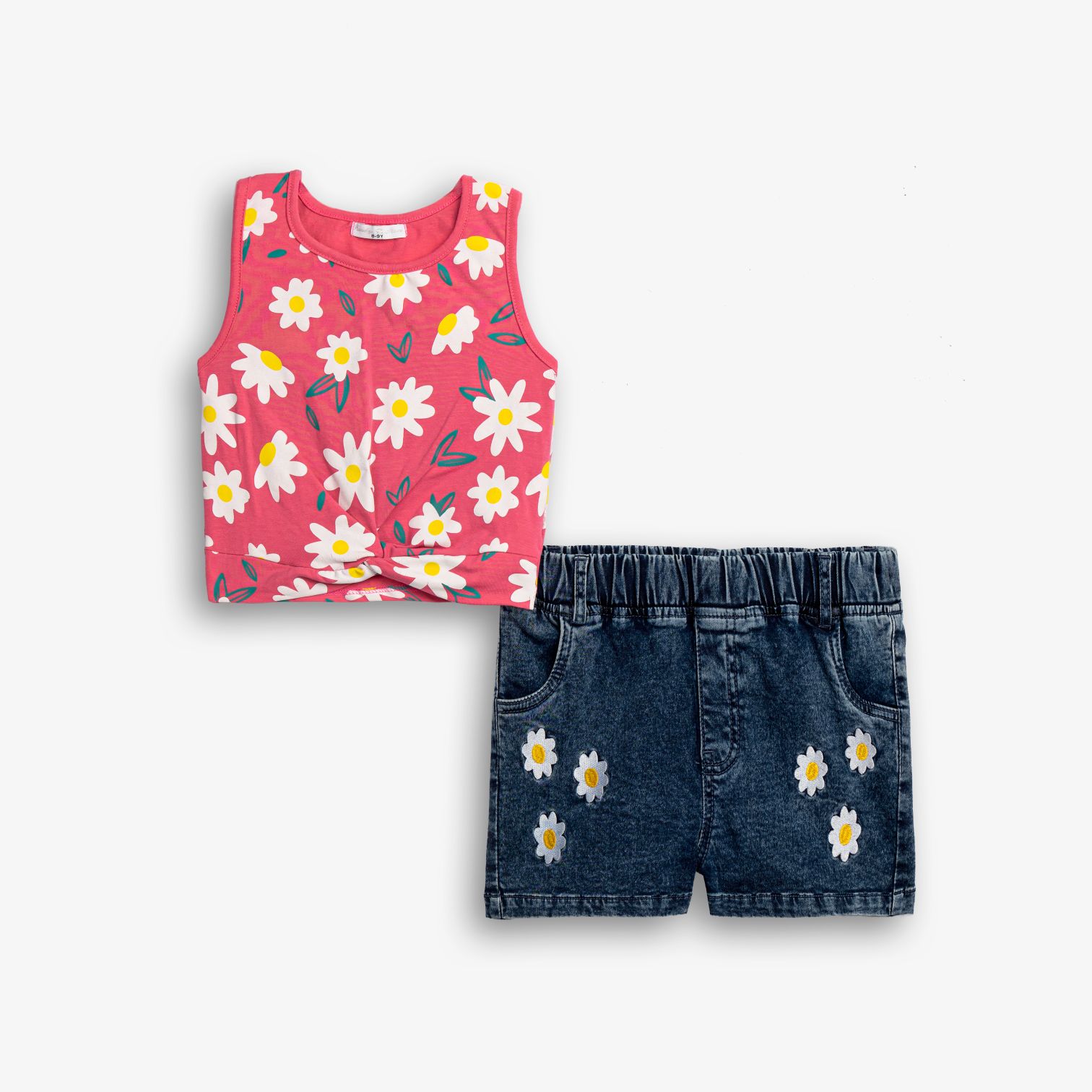 Σετ μπλούζα κάλτσα λύκρα με τύπωμα (λουλούδια) allover και σόρτς τζίν λύκρα σε χρώμα φλαμίνγκο/μπλέ τζίν για κορίτσι 6-16 ετών. Ποιότητα 95% COTTON ,5%elastan