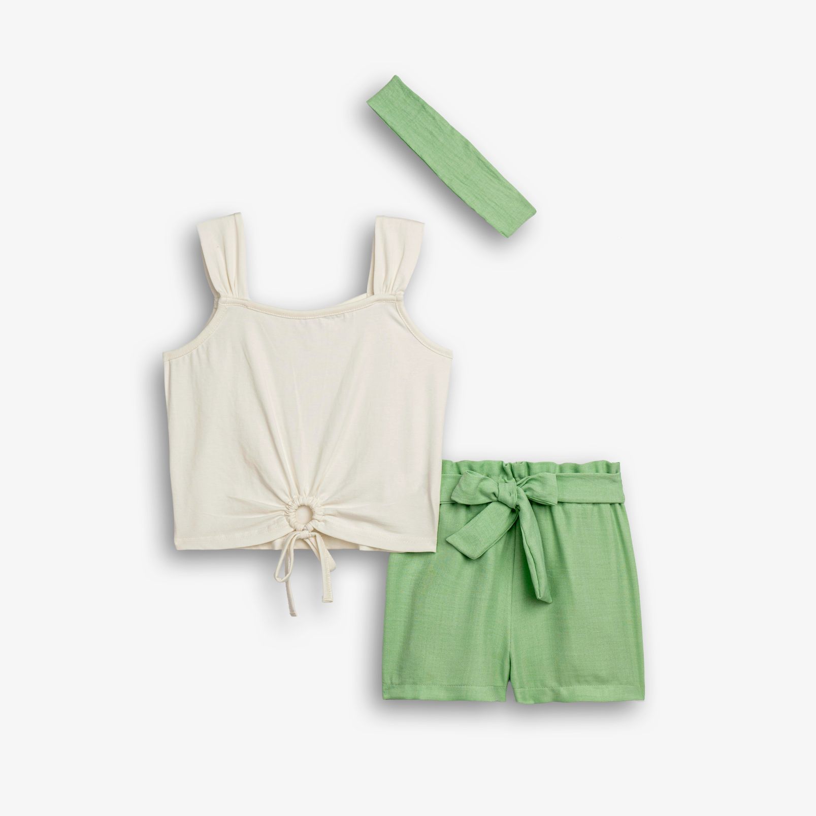 Σετ 3 τεμαχίων,μπλούζα-σορτς υφασμάτινο-αξεσουάρ μαλλιών για κορίτσια για πιο επίσημες καλοκαιρινές εμφανίσεις.