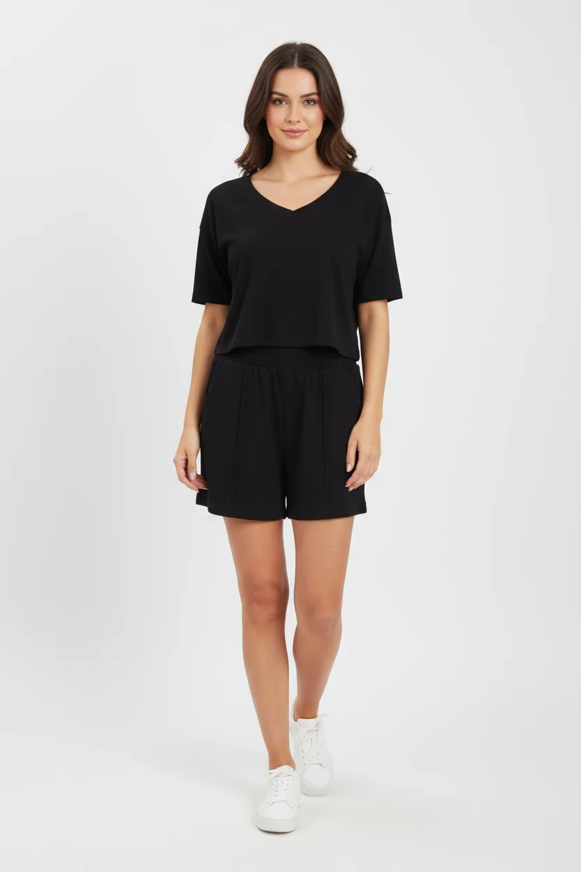 Paco & Co. Γυναικείο Σορτς Μαύρο. Σετ σορτσ με φαρδύ μπλουζάκι V πλέξη jersey, άνετη γραμμή. Σύνθεση: 100% cotton.