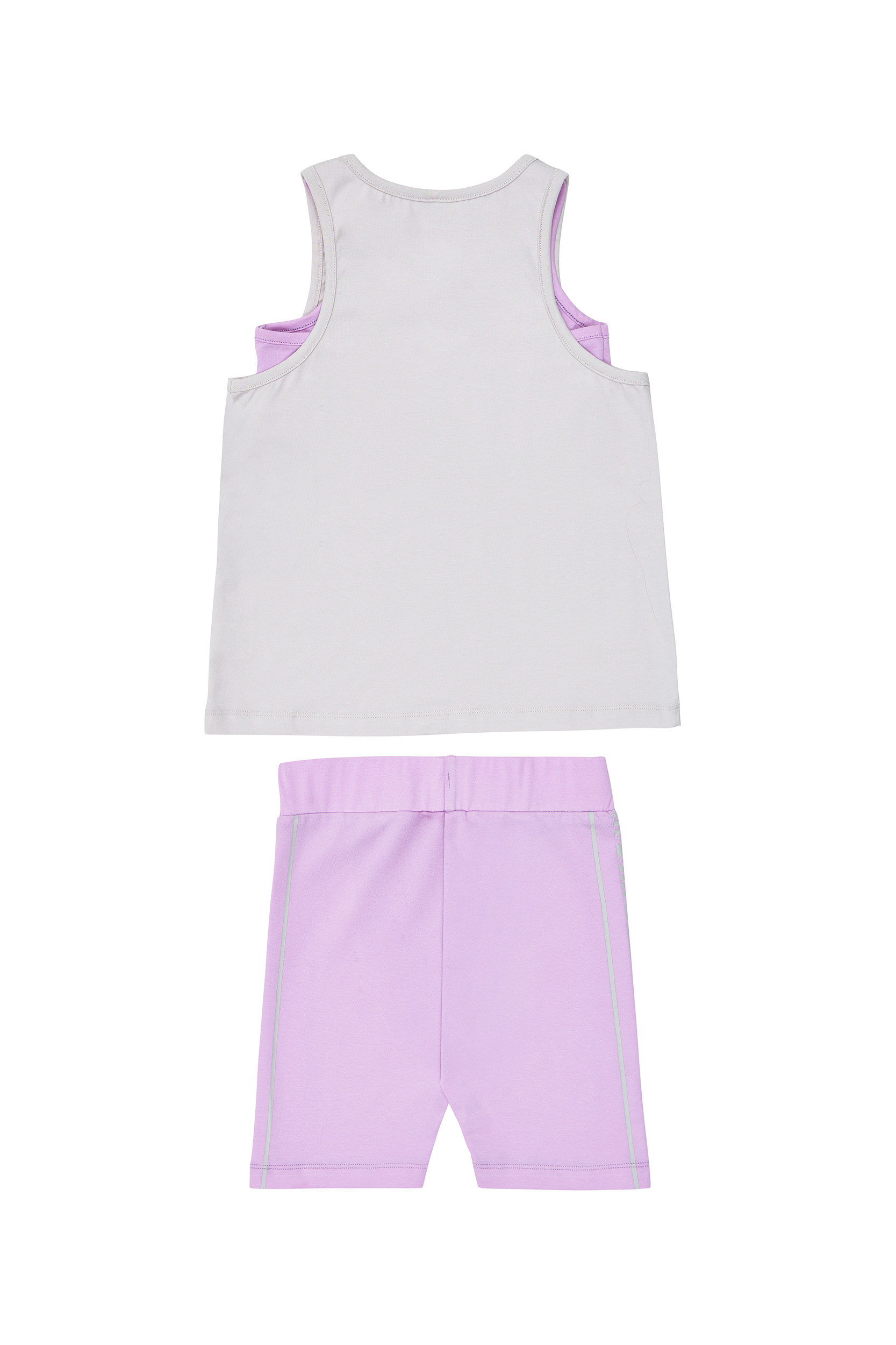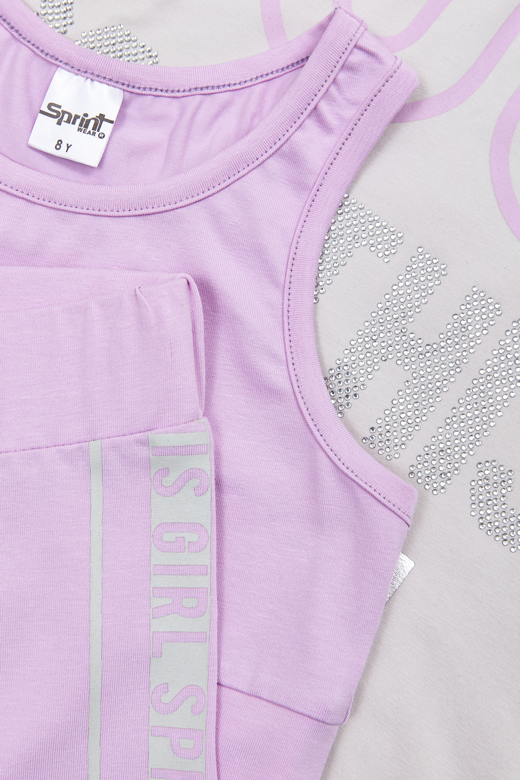 Sprint βαμβακερό παιδικό σετ για κορίτσια με λιλά ποδηλατικό κολάν και μπουστάκι και ανοιχτό γκρι αμάνικη μπλούζα από πάνω με γράμματα στρας. Ιδανική επιλογή για καθημερινό ντύσιμο στη βόλτα αλλά και για άθληση.