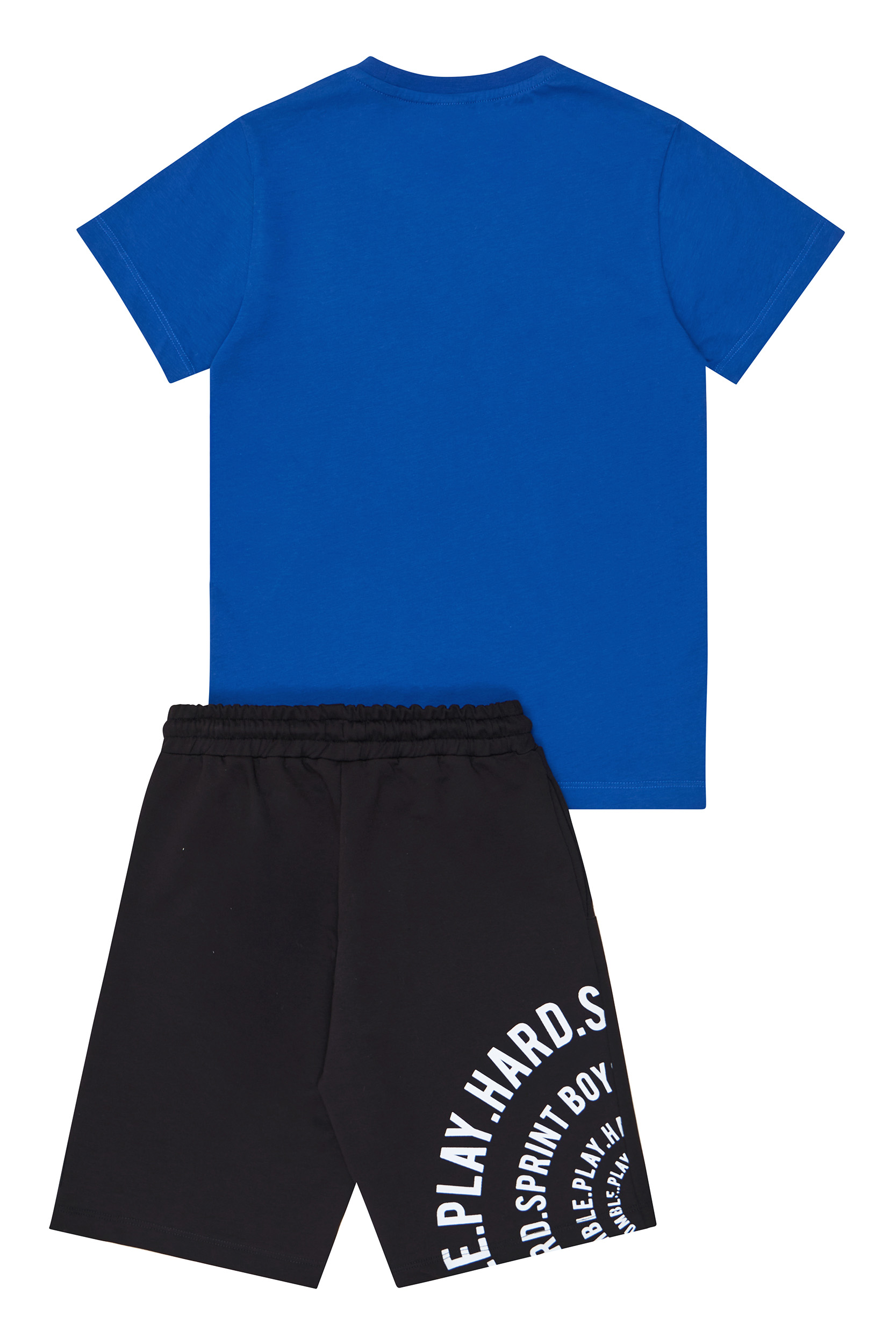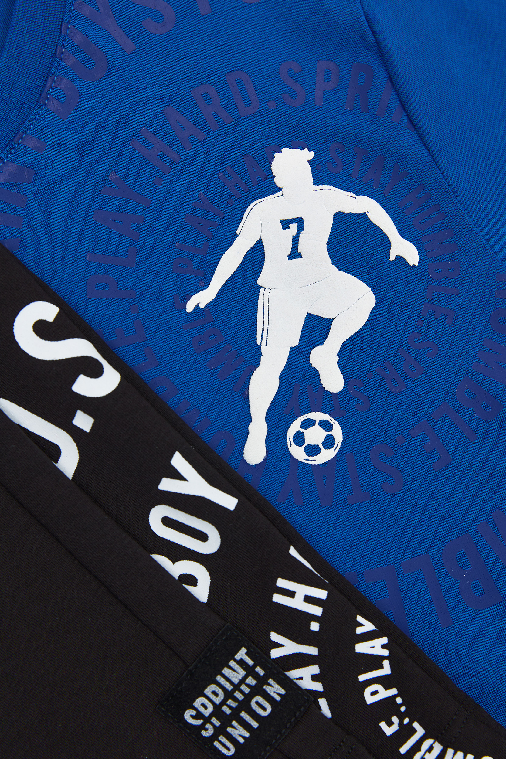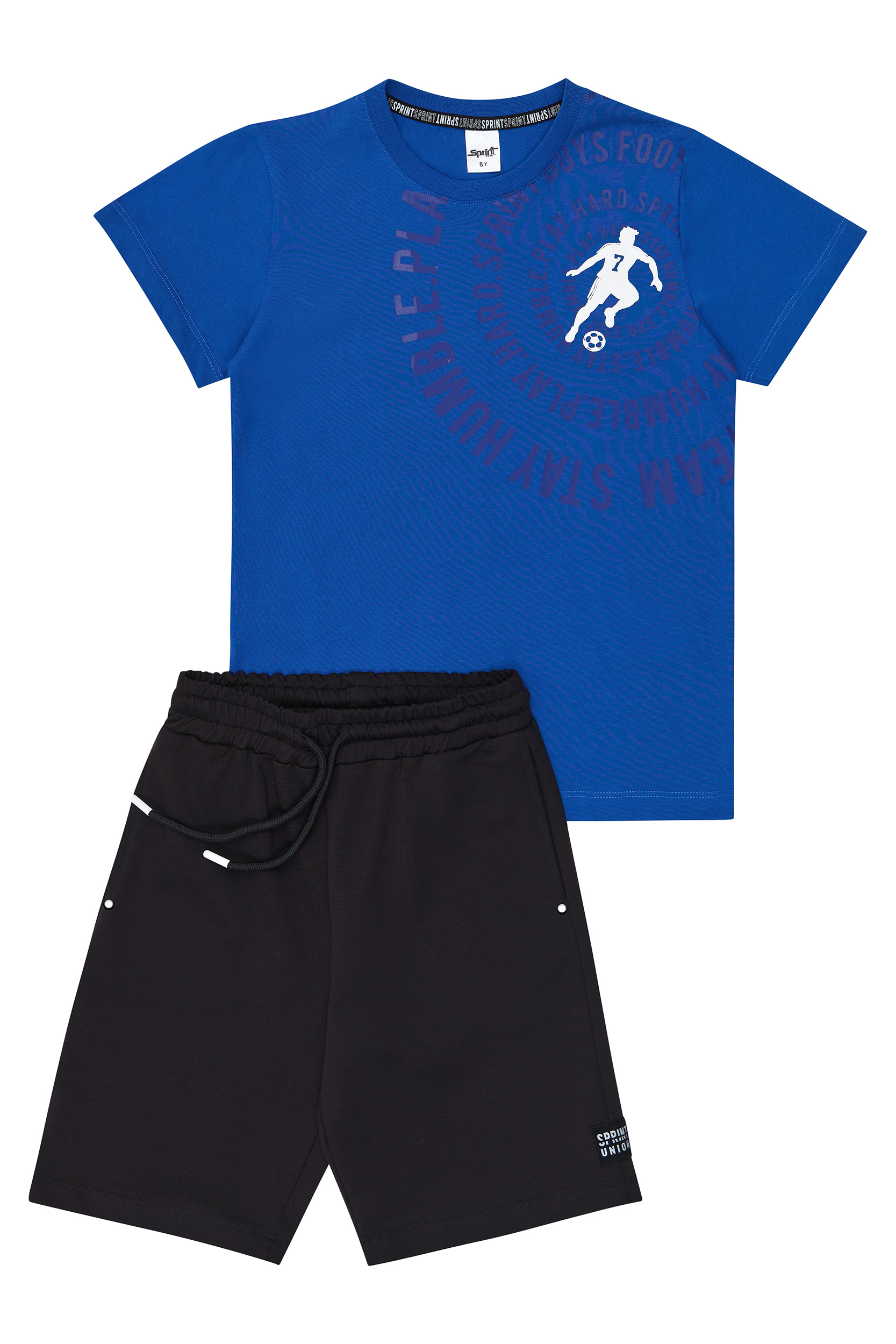 • Παιδικό σετ 2 τεμαχίων. Μπλούζα με κυκλική στάμπα “Stay Humble Play Hard” και φιγούρα ποδοσφαιριστή στο κέντρο. Βερμούδα φούτερ με ελαστικό ζωνάρι και ρυθμιζόμενα κορδόνια, πλαϊνές τσέπες και τύπωμα με ετικέτα SPRINT logo στο κάτω μέρος.